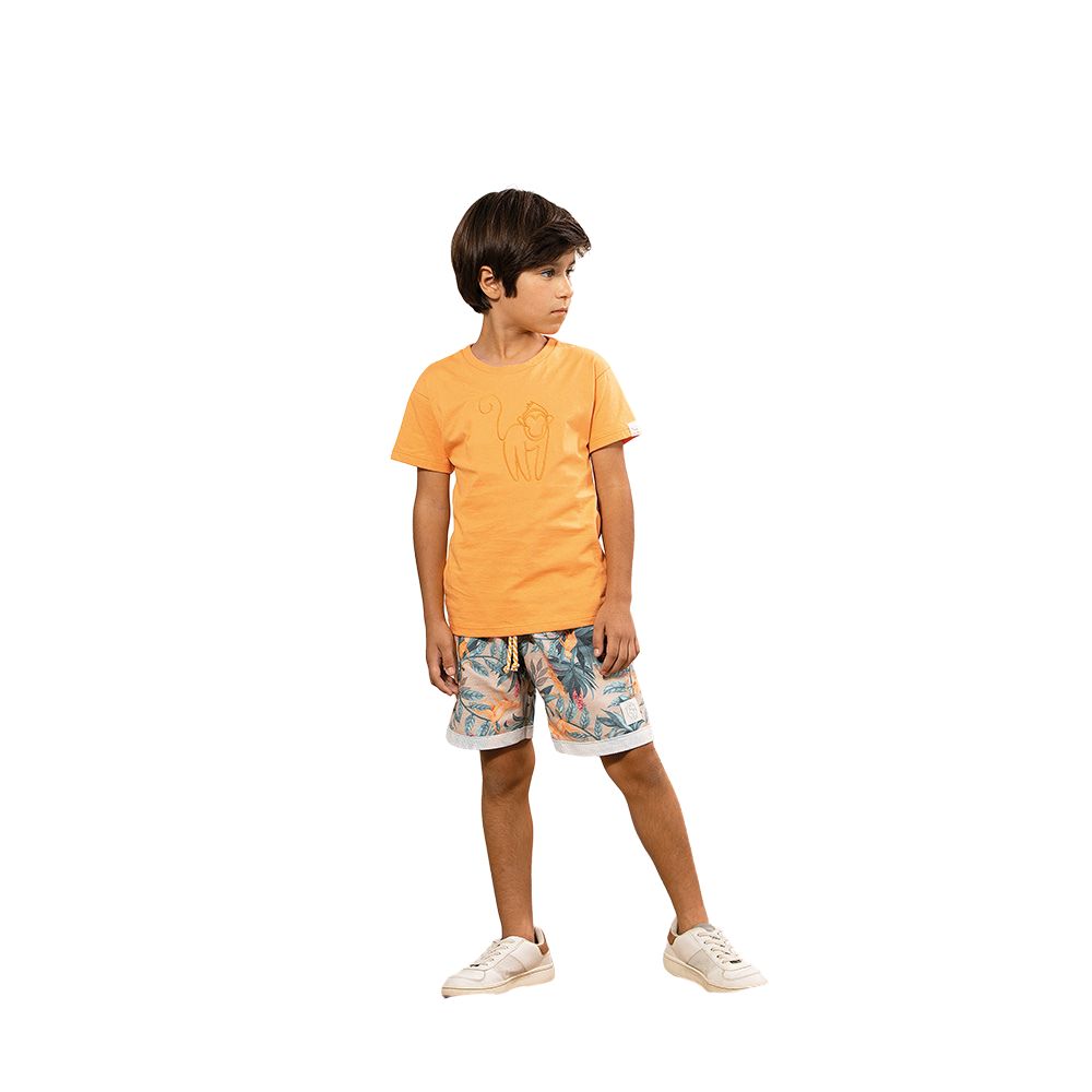 “Camiseta infantil masculina em meia malha, com modelagem com cavas levemente deslocadas. Detalhe em bordado local frente e etiqueta sarjada clipe, presa sobre a manga. Decote com tape interno em malha contraste com acabamento em ribana. Manga e barra bainha padrão. Composição 100% algodão. Bermuda infantil masculina em moletom ringado eco estampado, com cós da própria malha, com elástico interno e cadarço funcional para regulagem. Detalhe em etiqueta sarjada presa acima da barra. Possui bolso lateral funcional e barra dobrada com o lado avesso para fora. Composição 55% algodão, 38% poliéster e 7% linho.”